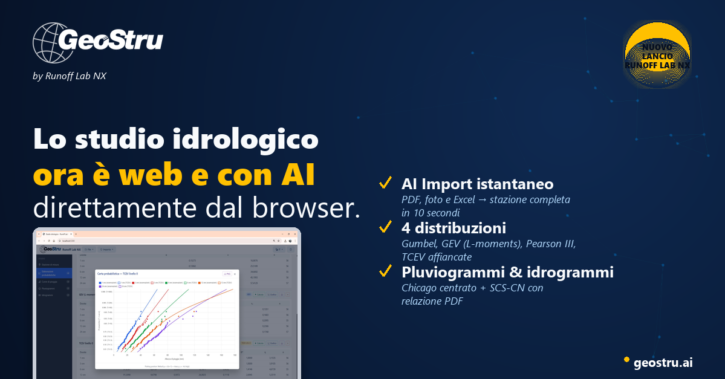 Runoff Lab NX brings the entire hydrological workflow to your browser — from the rainfall series to the flood hydrograph — and introduces AI Import: drop a yearbook PDF in, the artificial intelligence reads the document and populates the station in seconds. It’s the first web application of the new GeoStru NX suite. The analysis…